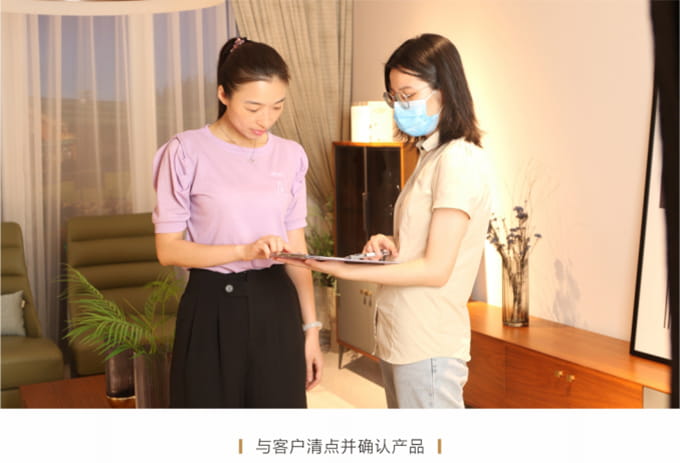 耐心解答客戶提出的關(guān)于家具保養(yǎng)的提問(wèn),同時(shí)將圣蒂斯堡產(chǎn)品使用說(shuō)明書送給客戶,爾后教客戶如何掃描產(chǎn)品二維碼進(jìn)行防偽鑒定,請(qǐng)顧客對(duì)貨物進(jìn)行驗(yàn)收檢查,然后正式簽收《產(chǎn)品配送單》。