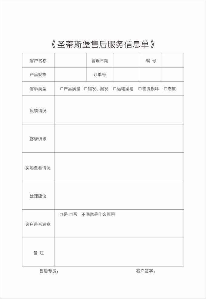 現(xiàn)場(chǎng)修復(fù)完成后,請(qǐng)客戶確認(rèn),在《圣蒂斯堡售后服務(wù)信息單》上簽字;不能現(xiàn)場(chǎng)修復(fù)時(shí)則必須跟客戶說(shuō)明清楚,征得客戶同意后將產(chǎn)品帶回處理或返廠處理,應(yīng)開(kāi)具相關(guān)收據(jù)交予顧客,并且登記備案;修理完畢后按照配送流程送到顧客家后應(yīng)向顧客索回收據(jù),并且請(qǐng)顧客在《圣蒂斯堡售后服務(wù)信息單》簽字。