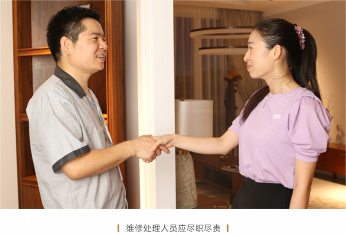 產(chǎn)品處理完畢后必須一站式通檢,指導(dǎo)客戶使用,并將服務(wù)過(guò)程中產(chǎn)生的垃圾隨手帶走,家具維修完畢后,應(yīng)用毛巾將家具擦拭一遍,確保產(chǎn)品清潔。