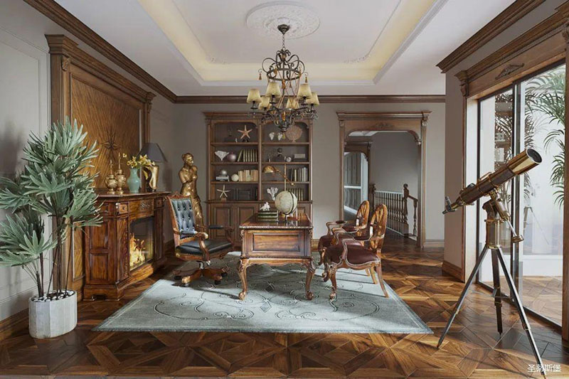 書房護墻板是由白楓木皮拼接的花鬘圖案,顏色層次分明,立體感超強,營造了滿滿的美式鑲嵌藝術感。深沉木色邊柜在護墻板上延伸,逐漸浸染了古銅色的家具和燈飾,結合著拱形羅馬柱,塑造出端雅大方的環(huán)境氛圍。