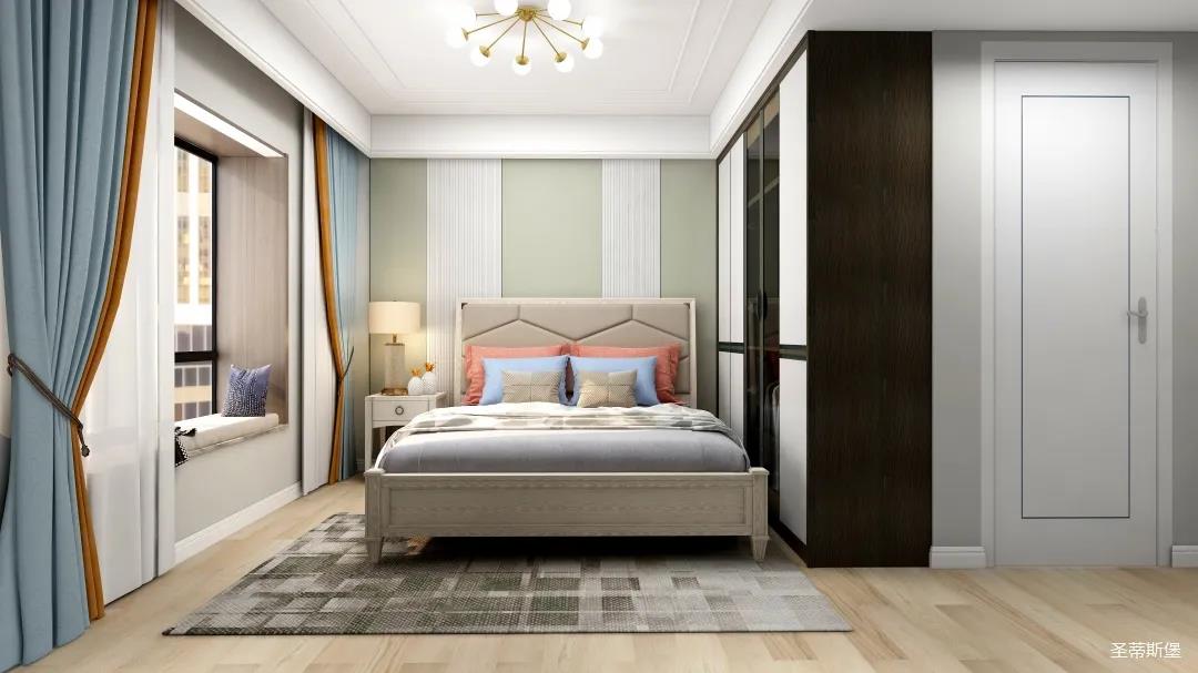 主臥的木飾護(hù)墻配以淺綠與魚肚白相間,色彩清新自然,層次分明。實(shí)木質(zhì)感與清新色彩,為休憩時(shí)刻注入強(qiáng)烈的氛圍感與隨性感。