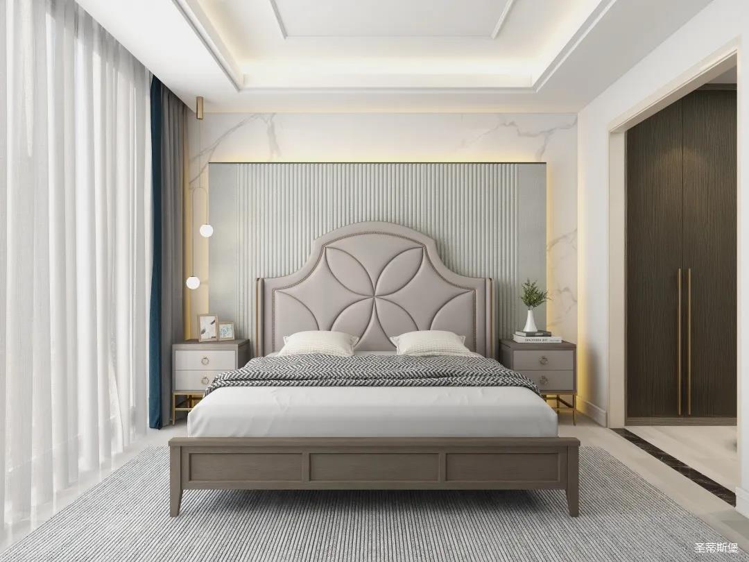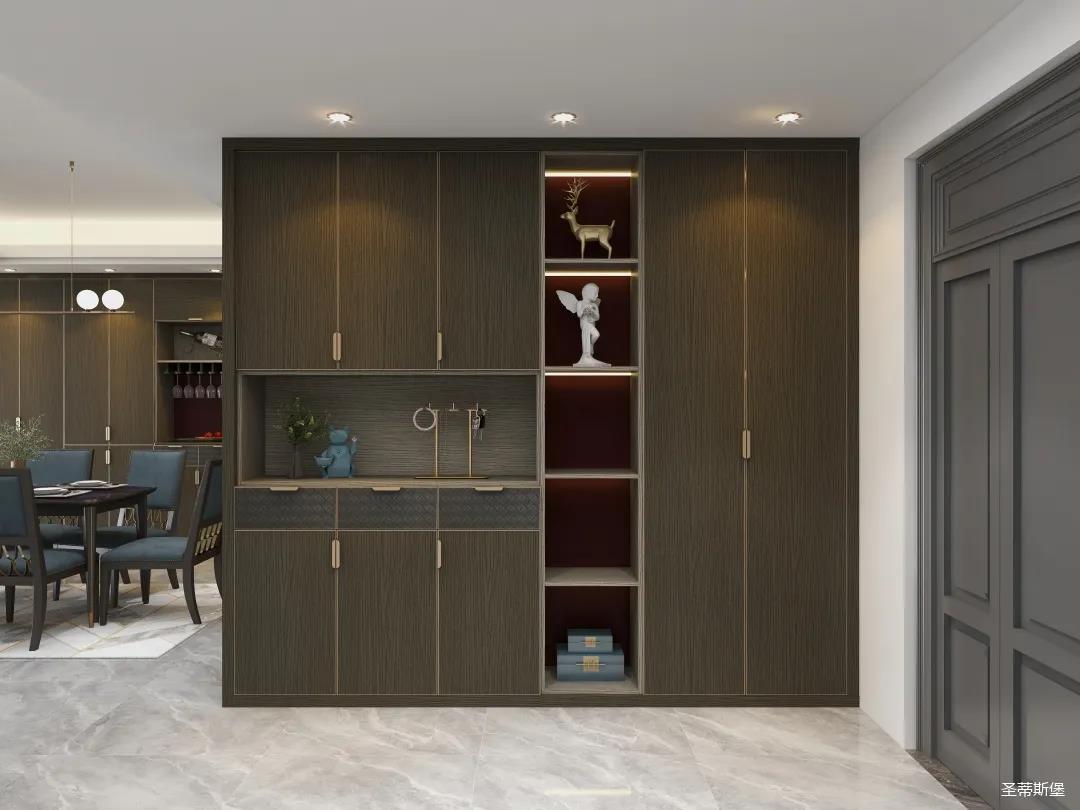材質(zhì)的交替與光影的變換,具有濃濃的現(xiàn)代簡奢色彩。獨一無二的英倫爵士灰定制柜,由延邊鑲嵌的香檳金拉絲金屬分割,線條流暢且奢華,不僅代表著時尚,也崇尚了實木韻味。設(shè)計師將現(xiàn)代、實用、精致的藝術(shù)設(shè)計風格應(yīng)用其中,更是精致生活方式的藝術(shù)演繹。在平靜的空間中表現(xiàn)出獨特的藝術(shù)骨感,滿足我們對精致生活的精神追求。
