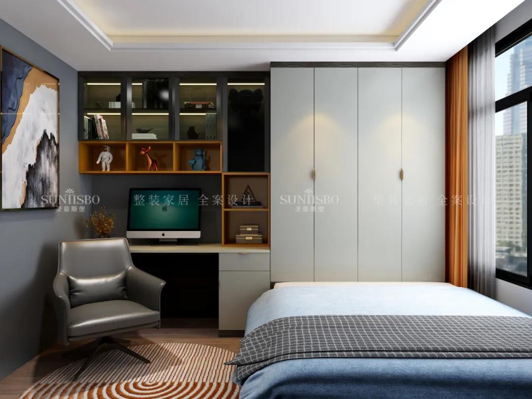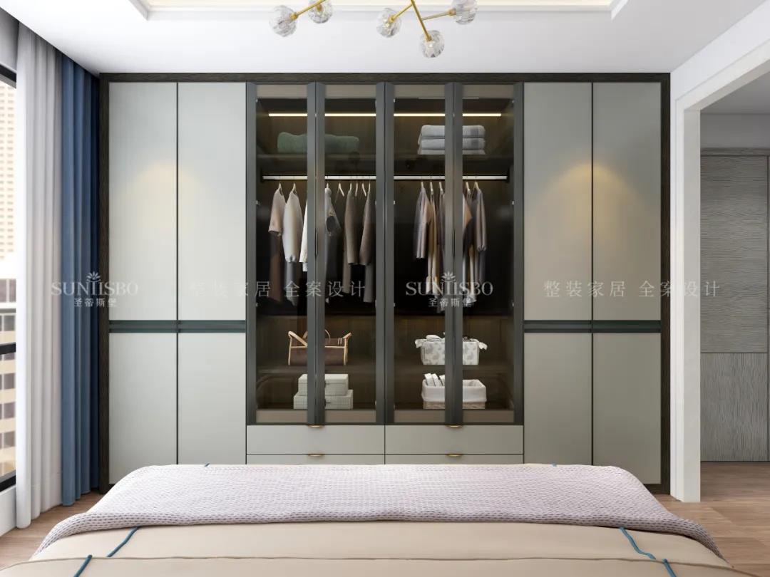 設(shè)計師運用最為百搭淺灰實木護墻板打造主臥空間,簡約的線條縱橫交錯,帶來了干凈、清爽、舒適的視覺效果。明暗分區(qū)的衣柜在燈光的渲染下,虛實光影變換其中,為每個角落氤氳出浪漫的氣息。