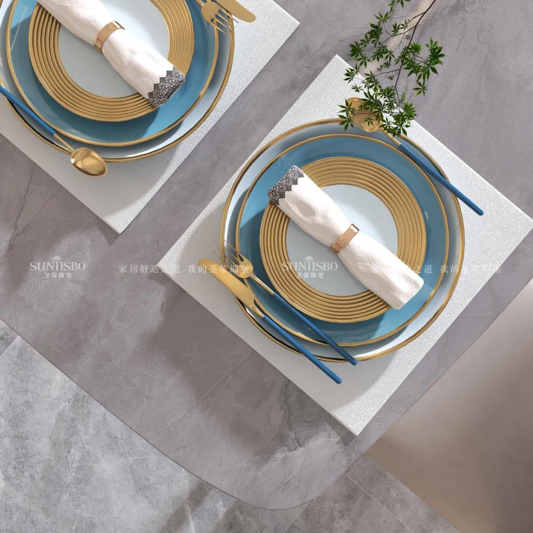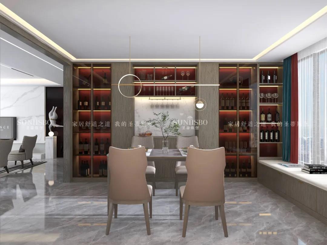 簡(jiǎn)奢餐桌與玻璃大立柜,將空間簡(jiǎn)化,帶來了純粹的空間視覺效果。金色鑲邊的點(diǎn)綴,為這份純粹增添了奢華質(zhì)感。極簡(jiǎn)玻璃定制柜體,拉開了大空間的開闊視野,光影交匯間,硬朗的氣質(zhì)與柔和的自然光產(chǎn)生了趣味的互動(dòng),為空間提供了更具藝術(shù)張力的奢享用餐體驗(yàn)。