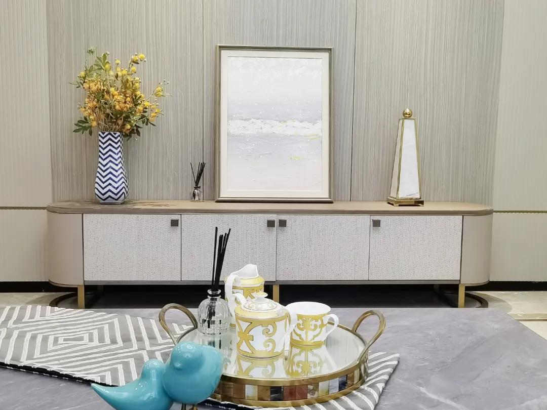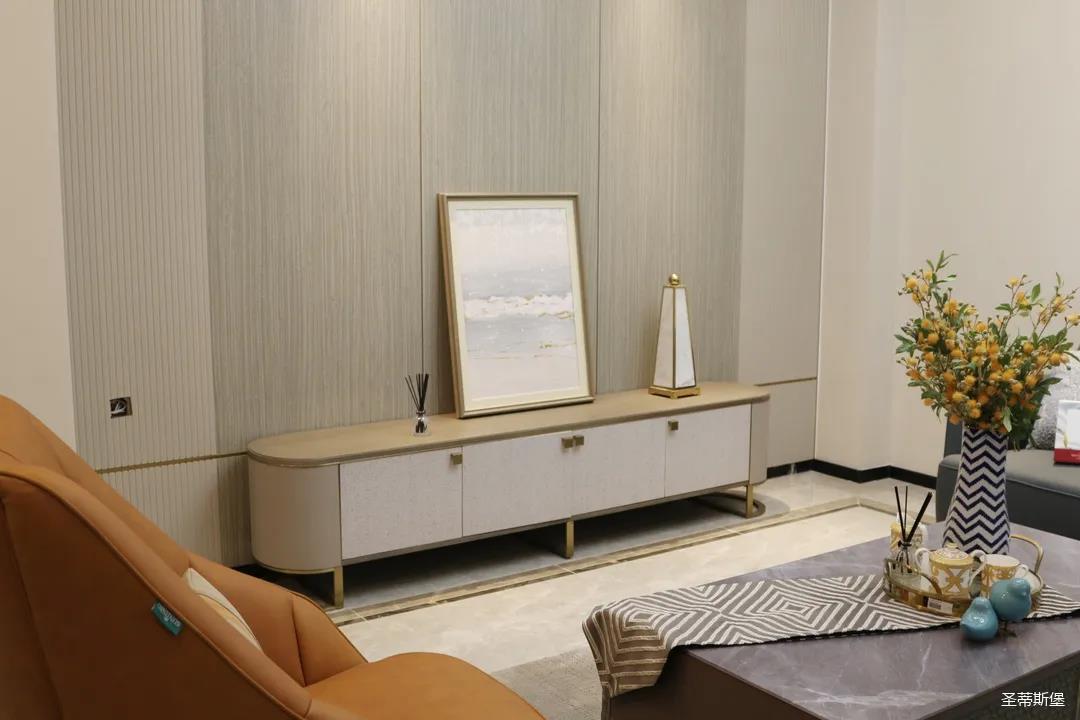 淺灰為基底的飾面與低飽和度的深色沙發(fā)相互映襯,產(chǎn)生強(qiáng)烈的視覺沖擊,深色的家具讓空間從視覺上衍生出一種縱深感。巖玻的質(zhì)感與真皮編織的紋理盡顯現(xiàn)代之美,細(xì)節(jié)陶瓷擺件注滿了空間優(yōu)雅的藝術(shù)氛圍。