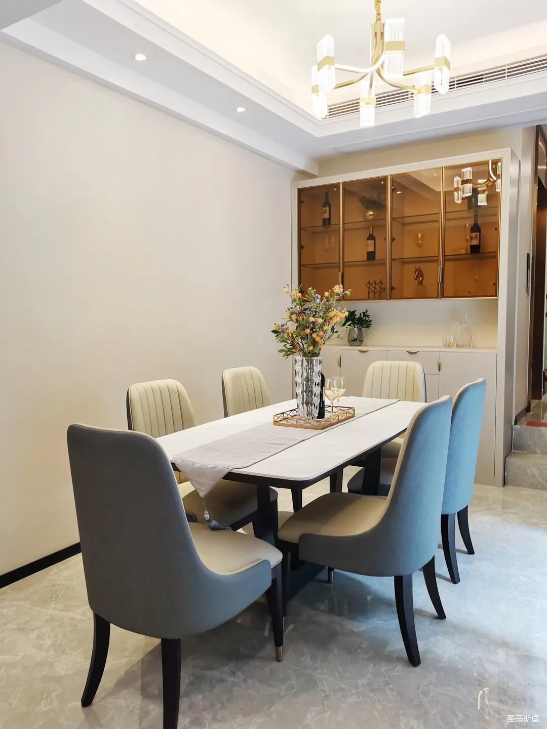 客餐廳雖屬同層,但由廊道隔開,各有寬闊的空間格局,加上引入自然光源的采光設(shè)計(jì),空間通透明亮。巖板餐桌搭配的真皮餐椅,讓不同的材質(zhì)在在空間完美契合,既增加了空間的時(shí)尚氛圍,也能給人良好的用餐體驗(yàn)。