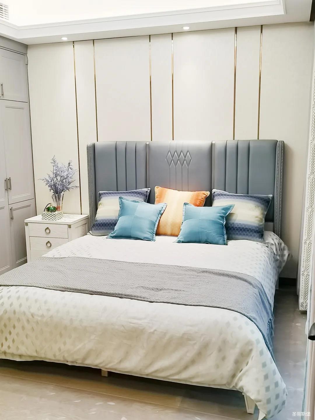 一樓的房間業(yè)主是作為長(zhǎng)輩房,采用輕奢的背景墻面,結(jié)合亮眼的金屬線條設(shè)計(jì),空間顯得時(shí)尚又不失沉穩(wěn)。莫蘭迪色的淺藍(lán)床屏,在無主燈設(shè)計(jì)與自然光線的碰撞下醞釀出不同的光影美感。