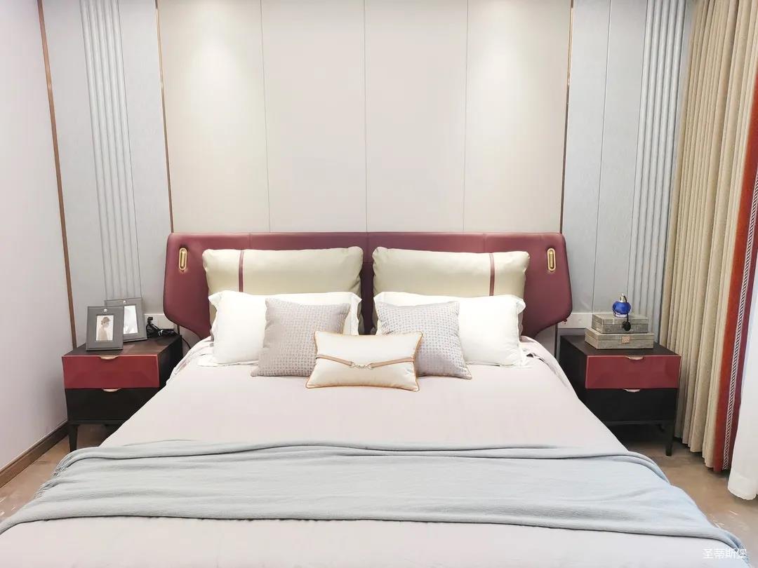 三樓的主人房設(shè)計(jì)風(fēng)格更偏向簡(jiǎn)約,浪漫的酒紅色床屏運(yùn)用了曲面造型,融合了極簡(jiǎn)主義美學(xué)和輕奢元素,小型夜間感應(yīng)燈設(shè)計(jì)讓每一處細(xì)節(jié)都充滿著時(shí)尚優(yōu)雅的氣息。夜間倚靠在厚實(shí)的軟包上,時(shí)光好像在不知不覺中慢了下來,讓我們能品味和咀嚼生活的氛圍。