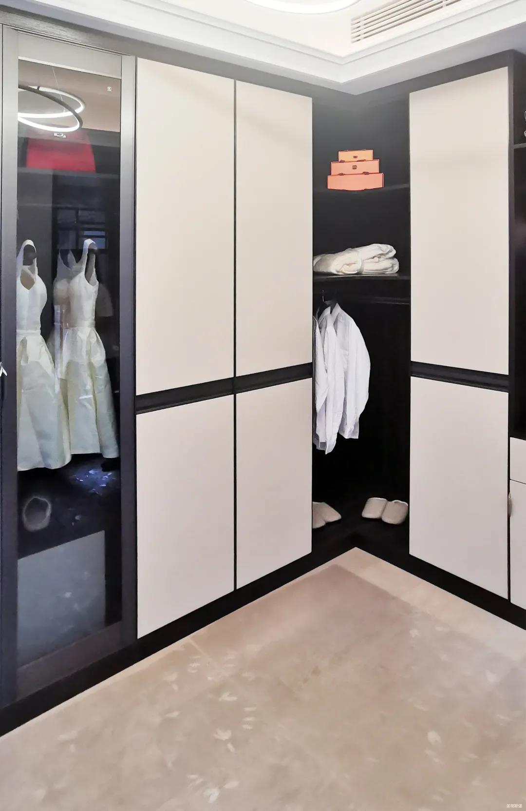 衣帽間以現(xiàn)代極簡(jiǎn)設(shè)計(jì)手法引入輕奢元素,借助實(shí)木與金屬組合打破了傳統(tǒng)儲(chǔ)物區(qū)的沉悶感,煙熏色橡木紋的定制柜體,色澤好似一杯溫暖醇香的摩卡,令空間層次感與立體感的格調(diào)頓生,予以沉穩(wěn)舒適感官體驗(yàn)。