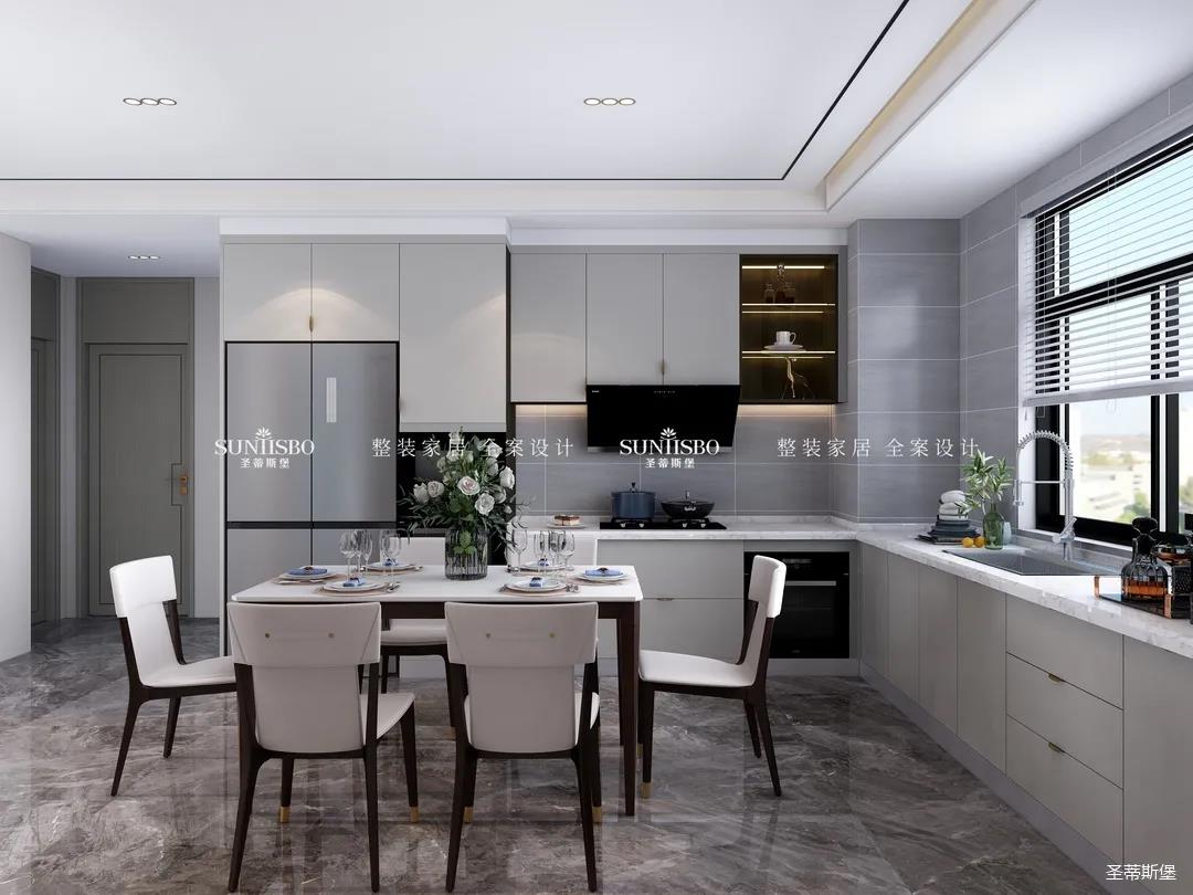 餐廚采用開放式布局,實現(xiàn)開闊明朗的公共空間,也提高了居家交流互動的便利性。減少不必要的物件,加上合理的設(shè)計,布局出和諧安全的居家環(huán)境。