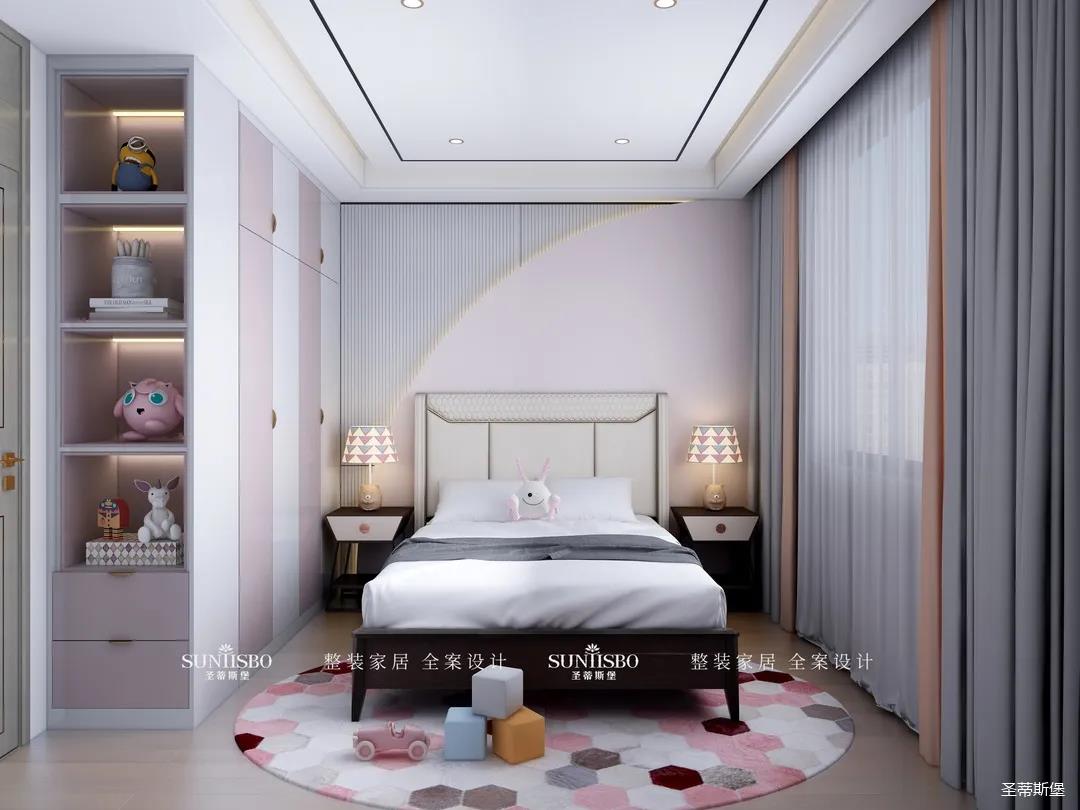 兒童房相對于其他空間更立體自然,幾何紋理的床屏和床頭柜延續(xù)了空間獨特的設(shè)計元素,菱格形的地毯,色彩交錯排列,滿足了兒童房應(yīng)有的童真與想象力。粉白相間的定制收納,搭配同色系充滿童趣的動物公仔擺件,儼然成為了兒童的夢幻小天地。