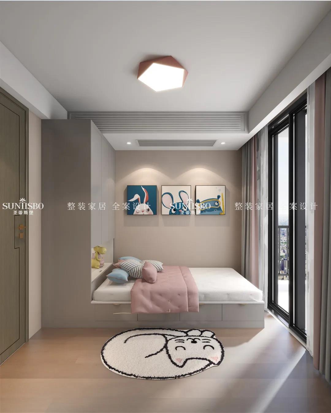 在設(shè)計(jì)之前,業(yè)主就預(yù)留了寶寶房,寶寶房實(shí)用又溫馨,榻榻米床可以做收納柜使用,收納寶寶的換季衣服、玩具等。在色彩上搭配也是采用的莫蘭迪色系。這樣的兒童房誰(shuí)能不愛呢?