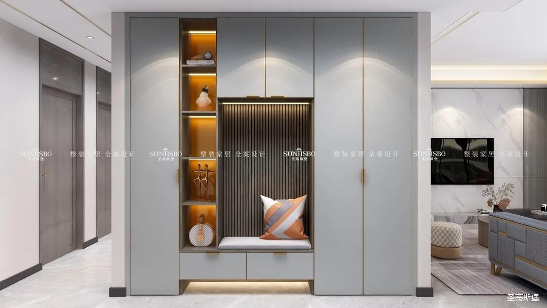 開門即見寬敞實用的玄關柜體。暖黃色的燈帶,不僅增加了室內(nèi)環(huán)境的層次感,更是創(chuàng)造了隱形的光環(huán)境。