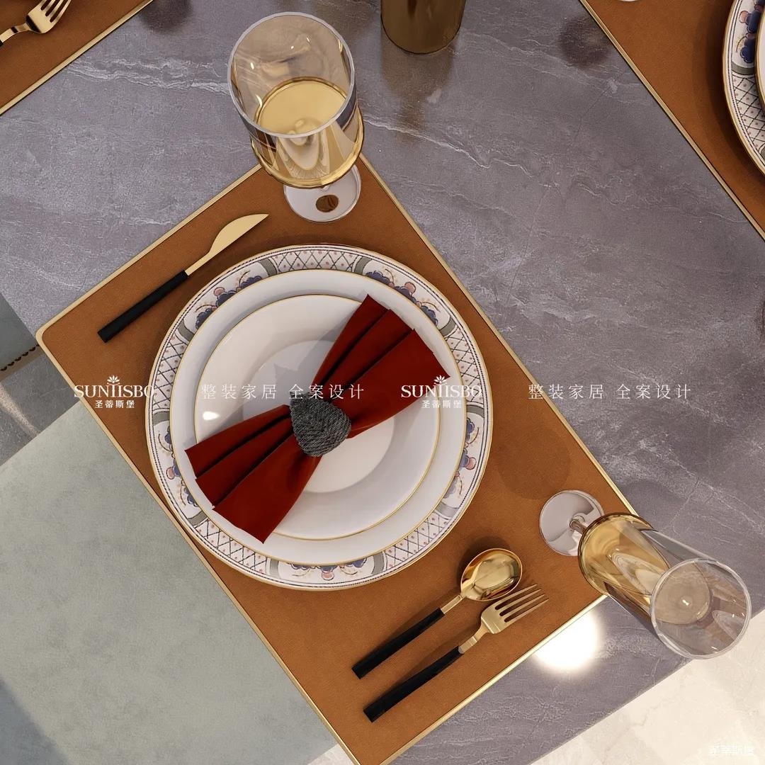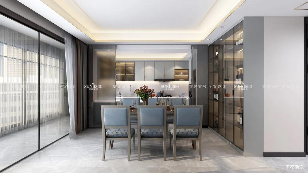 設計師通過對居者在空間中互動關系的細致設想,遵循經(jīng)典的簡奢風格設計,細膩考究人居與空間關系,反復推敲布局,將客餐廳橫列排布,增加居者的交流互動。
