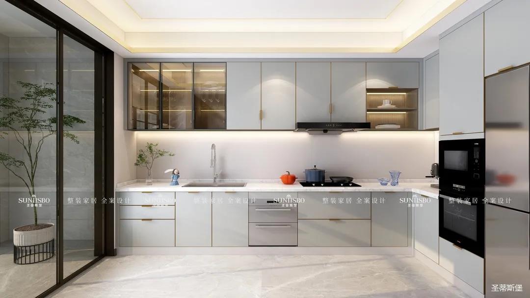 廚房現(xiàn)代智能的設計對精致生活進行了全新的詮釋,同時也呈現(xiàn)了居者追求精簡生活的內(nèi)涵。智能的廚房電器嵌入同色系的柜體中,時尚科技感十足。