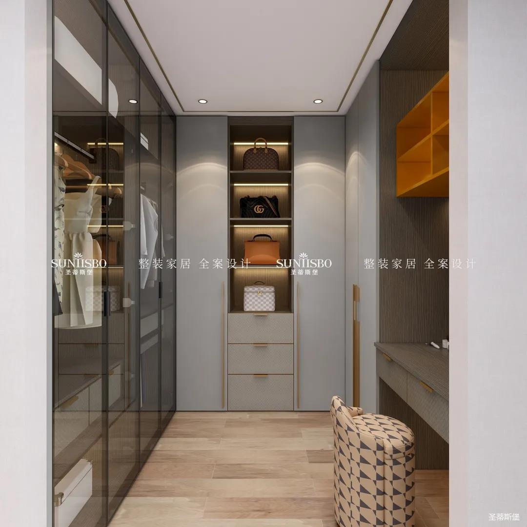 衣帽間選擇淺灰作為空間主色調(diào),設計師在衣帽間用與整體空間相似的愛馬仕橙作為點綴,使空間具有“簡于形,奢于心”的時尚審美內(nèi)涵。