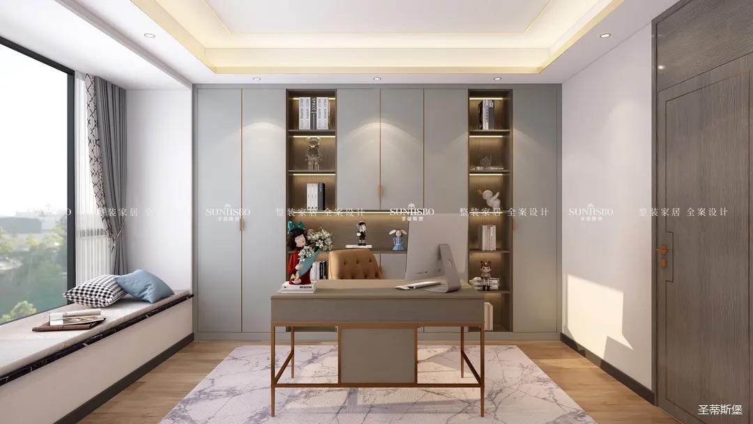 書房以淺灰作為主色調(diào),設計師在整個空間沒有選擇其他顏色進行相互雜糅,讓書房完全釋放了簡約的風格,無主燈的設計理念更是突出了空間層次感。細膩且富有光澤的金屬元素鑲嵌,在繁華的都市中傳遞著特有的文化氛圍。